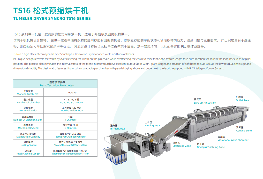 產(chǎn)品簡介:TS16plus的機(jī)械設(shè)計獨(dú)特,在烘干過程中使織物的經(jīng)向紗線有回縮的機(jī)會,恢復(fù)紗線的平衡狀態(tài),消除織物內(nèi)應(yīng)力,達(dá)到門幅、克重要求,織物具有手感蓬松、形態(tài)穩(wěn)定和降低縮水殘余率等優(yōu)點(diǎn)。